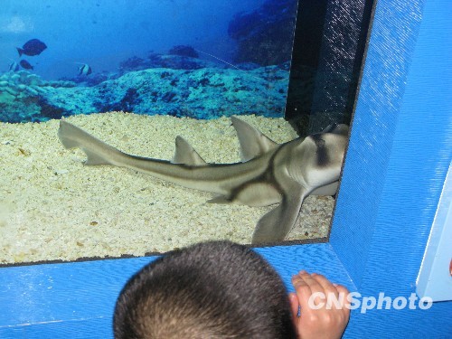 “虎虎生威,年年有鱼。”为了在新年讨个好口彩,上海海洋水族馆精心布置了“虎鱼”展,沙虎鲨、巨型老虎斑、澳大利亚虎鲨成为“明星”。馆方还专为虎年引进的新“虎伴”:模样凶狠的印尼“虎”,拥有老虎钳般强劲下颚的黄金河虎,还有貌不惊人在光线下会显虎斑的泰国“虎”。图中前来参观的小游客为贺岁“虎鱼”——虎鲨深深吸引。中新社发 陈静 摄