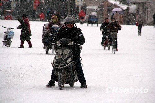 2010年2月11日,江苏宿迁地区普降粒米雪,道路积雪结冰严重影响了群众的出行。宿迁市气象台于2月10日22时59分由道路结冰黄色预警变更为橙色预警。中新社发 尤中原 摄