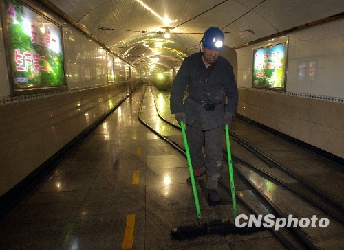 2月19日,河南省郑煤集团米村煤矿一工人正在井底巷道伴随着音乐声清扫地面。当日是虎年正月初六,矿井已开始新一年生产。该煤矿近年来不断改善工作环境,创造无尘化矿井,以保障生产安全和职工职业卫生健康。中新社发 苏丹 摄