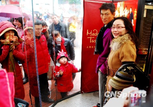 2月15日,春节期间,一酷似真人的刘德华蜡像惊现上海南京路一玻璃亭子内,吸引了不少游人。“华仔粉丝”纷纷与蜡像合影。中新社发 王大经 摄