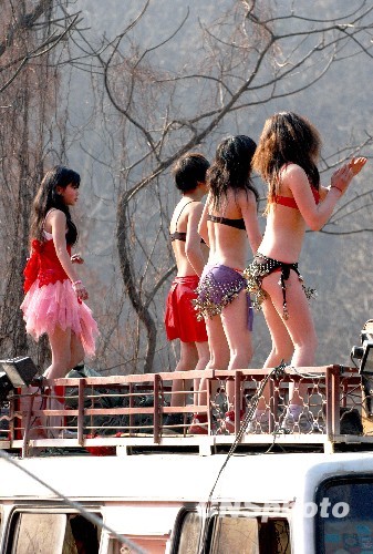 2月22日,在安徽滁州琅琊山初九庙会上,一家民间演出团体为了招引游客,派出穿着单薄的女演员,在演出大篷前的车顶上表演。中新社发 王家国 摄