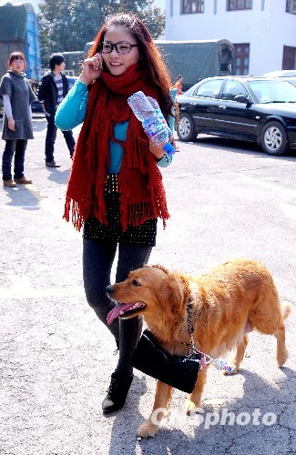 2月22日,安徽滁州市琅琊古道上一位时尚女士忙于通话时两手无空闲,而紧随身边的爱犬却担当了帮手,忠诚地用脖子“拎”起着主人的皮包前行。中新社发 王家国 摄