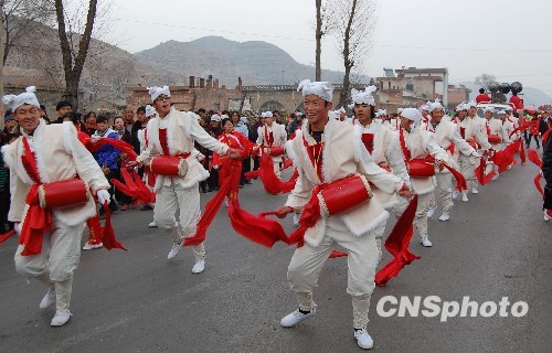 2月24日,山西吕梁积翠乡的秧歌队为群众表演。山西吕梁市下属的各个县区,纷纷组织各种文艺活动,欢度春节、喜迎元宵佳节。其中,吕梁市方山县由九家政府部门和7个乡镇组织的别具地方特色的秧歌队,最具特色。中新社发 刘玉明 摄