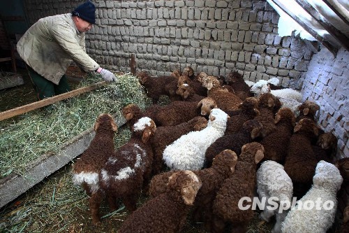 2月25日,新疆布尔津县一位农户正在照料刚出生不久的小羊羔。据当地政府介绍,近期该县各牧民定居点母羊陆续产下春羔,产量与往年相比不相上下,预计6月份旅游高峰期到来之前即可出栏销售。新疆北疆地区遭受60年不遇的低温强降雪天气后,各地政府采取各种手段抗灾保畜,为农牧民提供牧草及资金帮助。目前正值春季产羔期,由于措施得力,新疆北疆地区各牧民定居点春羔产量未受到雪灾影响。中新社发 刘新 摄