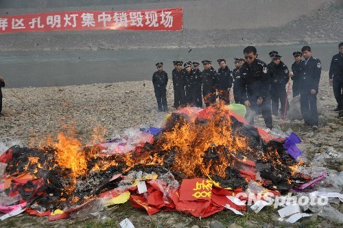2010年2月26日下午,四川省宜宾市在翠屏区集中销毁春节期间集中收缴的4000余个孔明灯。元宵节前后,宜宾还将开展专项行动收缴孔明灯。中新社发 陈涌徐伟 摄