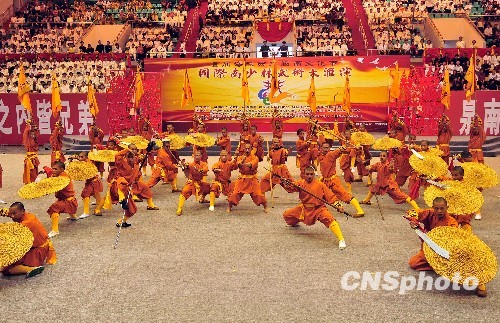 2月26日,来自福建泉州的南少林武僧团在国际南少林武术大汇演中精彩表演。当天,国际南少林武术大汇演在福建泉州举行。中新社发 张丽君 摄