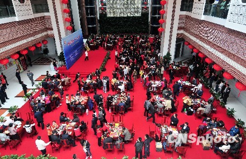 2月27日,作为首届海峡两岸闽南民俗文化节活动之一的“和谐海西·千人品茗”,在福建泉州中国闽台缘博物馆举行。数十张具有闽南特色的八仙茶桌依次摆开,上千名海内外嘉宾将落座其中,共同品评安溪铁观音、永春佛手茶,共话源远流长的两岸茶缘。中新社发 张丽君 摄