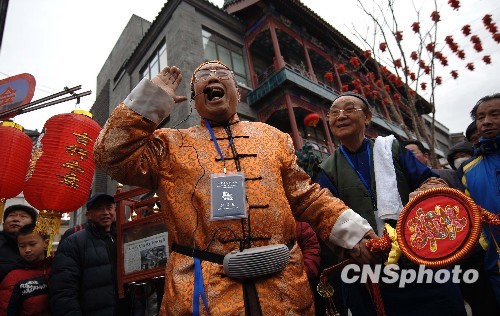 2月28日农历正月十五元宵节,北京举行前门天街上元灯会,北京叫卖真人艺术团张振元(左)在天街以老北京人的“歌喉”,为节日游人演唱近百年的北京商贩的叫卖声。中新社发 邹宪 摄