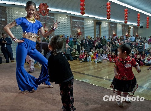 当地时间2月27日下午,中国驻旧金山总领馆举办领养中国儿童家庭新年庆会,100多个家庭应邀出席,与领馆工作人员的子女共同度过快乐新年。图为领事和儿童们表演精彩舞蹈,大人孩子看得津津有味。中新社发 陈钢 摄