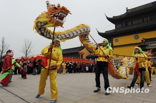 2月28日,中国传统节日“元宵节”,已有百年历史的杨桥老街民俗非遗专场表演走进中国最高佛塔—天宁宝塔。不仅数万中国人前来观看,来自德国、美国、俄罗斯、荷兰等6国的20余位在常州友好交流的外国友人也赶来玩转中国元宵节。图为六国友人舞龙表演。中新社发 唐娟 摄