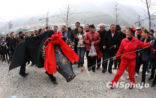 3月1日,四川都江堰市龙池镇格外热闹,当地村民用自己独特的方式来迎接新一年的开始,祈福新年风调雨顺。“5·12”地震发生后,都江堰龙池镇受灾严重,经过一年多的重建工作,如今这里面貌一新,一排排漂亮“别墅”洋房即将全面完工,400余户受灾家庭将在5月全部搬进新居,开始他们新的生活。中新社发 刘忠俊 摄