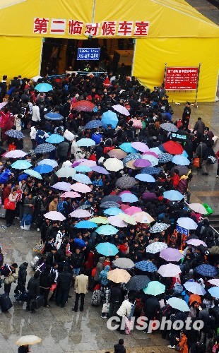 3月1日,九江火车站的大批旅客在雨中排队进站候车。当日,江西南昌铁路局迎来学生流和民工流叠加的节后春运客流高峰,加开临客70余列。据统计,南昌铁路局当天发送旅客达49.4万余人次,预计客流高峰将持续2至3天。 中新社发 胡国林 摄
