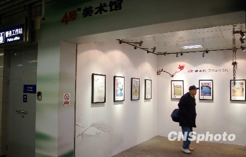2010年3月1日,4号线美术馆在北京地铁亮相,展厅中展出了数位当代艺术家的画作,虽然数量不多,但增加了地铁内的艺术氛围。中新社发 九州 摄