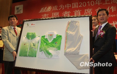 3月2日,上海世博会园区志愿者制服在上海亮相,特步总裁丁水波向上海世博局局长洪浩(左)赠送样衣。当日,上海世博局与特步(中国)有限公司签署合作协议,特步成为上海世博会园区志愿者唯一服装赞助商,提供8万套专用服装。中新社发 潘索菲 摄