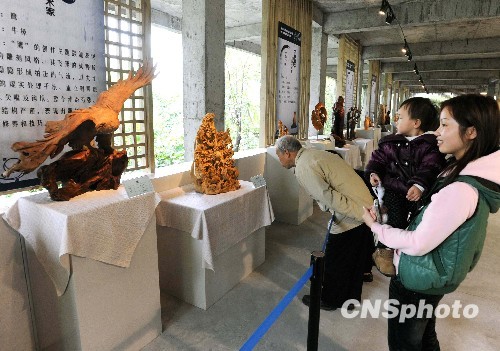 3月5日,正在福州举行的海峡两岸迎春木雕精品展上,展出的海峡两岸艺术家的200件优秀木雕作品,吸引了不少观众驻足欣赏。中新社发 刘可耕 摄
