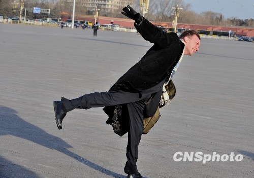 3月5日清晨的北京突然刮起五级寒冷大风,一位前往人民大会堂采访十一届全国人大三次会议开幕式的外国记者,在天安门广场做了一个随风飘舞的幽默动作。中新社发 贾国荣 摄