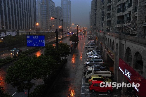 3月5日10时,杭城闪电雷鸣、风雨交加,大雨如注。整个杭城如同黑夜,电力部门为确保交通安全,马路两旁的路灯也都亮起。中新社发 来顺兴 摄