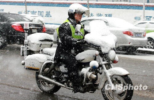 3月5日,河南郑州一名交警骑着警用摩托在风雪中巡逻。当日,郑州市区遭遇一场暴雪,4到5级的东北风使得温度骤降,市民出行受阻。中新社发 王中举 摄