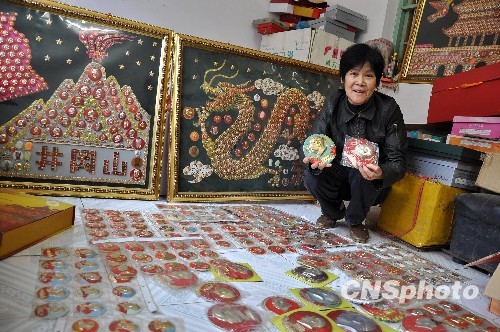 3月6日,江西省定南县居民黄瑛在展示收集到的毛泽东像章。刘仲文、黄瑛夫妇从1966年至今,44年来踏遍全国各地,投入资金50多万元,共收集金、银、木、竹、象牙、陶瓷等各种材质毛泽东像章1.7万个品种,3.3万余枚,其中不少像章属罕见的珍品。中新社发 刘海平 摄