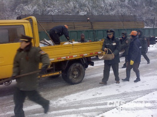 3月9日7时,闽赣交界的武夷山汾水岭半山腰黄莲坑以上路段开始下雪,至8时许约有5公里的路段积雪达2厘米以上。当地路政抢通小组通过撒盐等举措,消融路面积雪,至中午12时,暂时中断的闽赣边界道路交通基本恢复通车。中新社发 熊慎端 摄