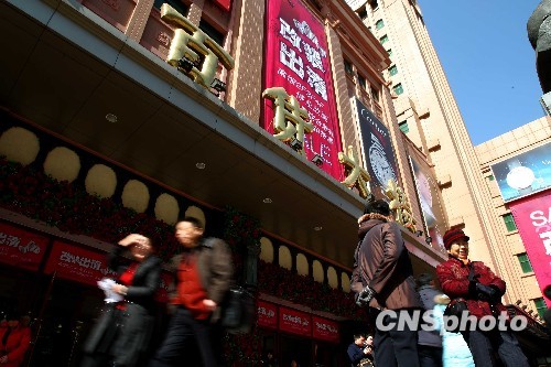 “55岁”的北京市百货大楼主楼3月15日将停业装修,预计今年8月露新颜。目前,各商家正在进行甩卖清仓。图为3月10日,位于王府井的北京市百货大楼门前悬挂着“改装出清”的牌子。由于南馆(主楼)2—4层将停业改装,全馆无论服装、鞋类,还是儿童用品、家用电器全部联合开展1—5折甩货。据了解,北京市百货大楼始建于1955年,在这55年中,只有1999年对其主楼结构进行过加固。中新社发 富田 摄