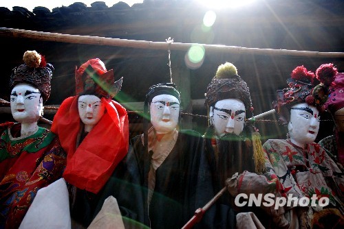 木偶戏,又称傀儡戏,是一种非常古老的戏剧。在湘乡市一带的民间木偶剧团,数已传承数代的莫家戏班尤为有名,莫家戏班的艺人在演出中均能身兼数职,仅有六七个人的戏班,却能在操控三把二胡、两支唢呐以及大小锣鼓等几种乐器的同时,还负责木偶的动作、唱腔和对白,演出忙而不乱,备受群众欢迎。3月11日,在湖南省新邵县坪上镇演出的木偶们。中新社发 吕建设 摄
