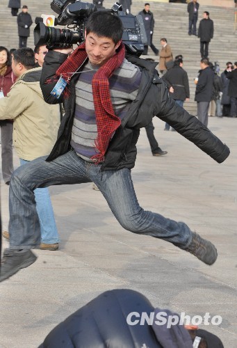 3月13日上午,一位摄像记者采访全国政协十一届三次会议闭幕会后,在北京人民大会堂前为同事做了一个飞跃动作。中新社发 贾国荣 摄