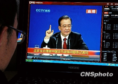 2010年3月14日,湖北宜昌市,网民通过网络直播观看温家宝总理答中外记者问。当日,十一届全国人大三次会议闭幕,中国国务院总理温家宝与“两会”的中外记者见面并回答记者提问。中新社发 刘君凤 摄