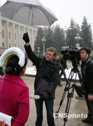 3月14日,十一届全国人大三次会议闭幕会在北京人民大会堂举行。当日,北京突降中雪,一名外国记者在采访时,撑伞为代表挡风遮雪。中新社发 汤彦俊 摄