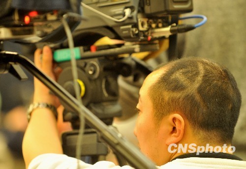 3月14日上午,一位头顶修剪着镰刀斧头标志的境外记者,在北京人民大会堂报道温家宝总理与采访“两会”的中外记者见面并回答问题。中新社发 贾国荣 摄