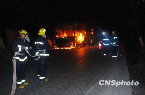 3月14日晚8时许,一辆载有44人的广东籍大客车在广西百色境内突发大火。客车在短时间内被烧成废铁,所幸车上人员及时撤离免遭伤亡。百色消防官兵随后展开灭火工作,并将大客车上的44名人员转移至市区安置。中新社发 罗行座 摄