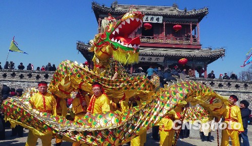 3月17日(农历二月二),首届中华龙抬头文化旅游节在河北省秦皇岛市山海关开幕,万里长城的起点河北山海关老龙头,金龙欢腾舞动,锣鼓热闹喧天。世界文化遗产山海关,拥有“国家级历史文化名城”、“全国万里边疆文化长廊”、“中国长城文化之乡”等美誉,在首届龙抬头文化旅游节上,一场盛大的民俗文艺展演让游客大饱眼福。中新社发 翟羽佳 摄