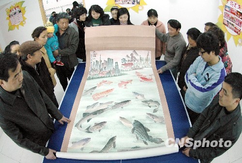 3月18日,安徽省芜湖市民间画家在吉和街道文化站首次展出中国画《鱼跃浦江》,画作者王宗荣用一年时间构思创作,内容以世界五大洲标志性建筑、鱼种和世博会吉祥物等,表达世界是一个大家庭,人类共有一个地球的主题思想,企盼上海世博会的召开。中新社发 陈立希 摄