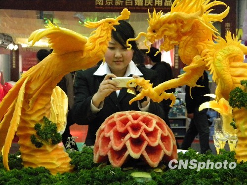 3月19日上午,南京史上规模最大的“婚博会”在南京国展中心举办,海内外200家名企争分南京400亿元婚庆“蛋糕”。图为豪华的龙凤结婚套餐吸引参观者。中新社发 朱晓颖 摄