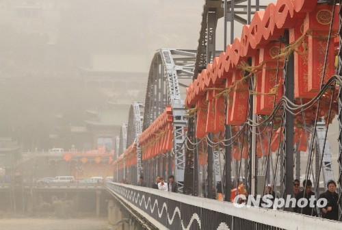 3月19日,兰州遭遇强沙尘暴袭击,最低能见度仅为300米。站“黄河第一桥”中山桥上,相望对面的白塔山,却是朦朦胧胧。中新社发 殷春永 摄