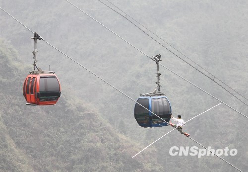 3月20日,新疆达瓦孜传人赛买提·艾山在张家界天门山高山索道上表演“空中劈叉”等高难度动作。赛买提此次是与欧洲高空钢丝极限之王、瑞士人弗雷迪·诺克一同挑战天门山索道中倾斜度最大、两端支架跨度最大的一段,但由于受伤和鞋底打滑等原因,极限挑战双方最终都中途放弃比赛,遗憾收场。中新社发 邓霞 摄