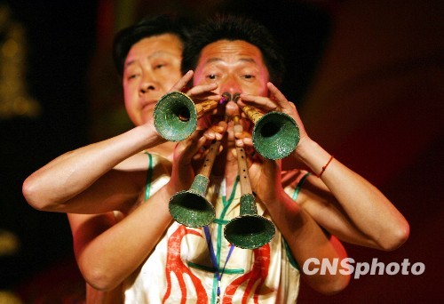 3月21日,来自甘肃、陕西、河南、新疆、湖南等10个省(自治区)20名选手在四川丹棱唢呐广场展开唢呐PK,图为一位参赛选手正在展示唢呐绝活。中新社发 刘忠俊 摄