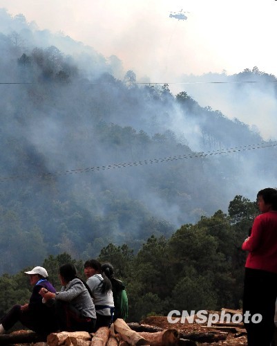 3月22日,距离云南丽江市14公里的玉龙县新团村附近山林发生火灾,火势凶猛,浓烟冲天。火灾发生后,当地武警古城森林中队和林业工作人员及时赶赴火灾现场灭火,数架直升飞机轮番在空中向火场洒水。据当地村民称,起火山林主要为松树,以前从未发生过火灾。导致火灾的原因可能与近来当地持续大旱有关。截止目前,火势未见减弱,真正起火原因有待进一步查明。中新社发 潘旭临 摄