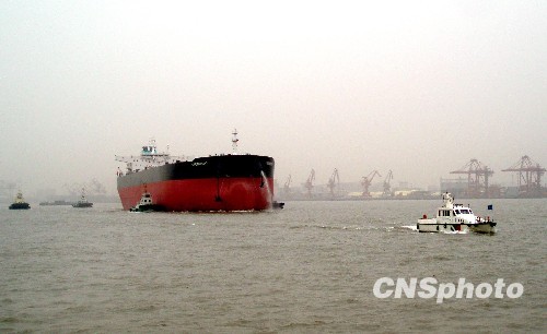 3月22日中午,正在长江南通段航行的15.6万吨巨型油轮“常明”轮的船长突报,主机失去了控制,航速无法降低。直至当日13时50分“常明”轮在23号浮附近安全锚泊时,它已在长江中“奔突”了近30公里。中新社发 朱晓颖 摄