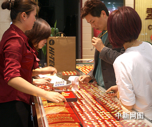 在股市、楼市低迷的情况下,投资性黄金越来越得到投资者的青睐。随着近期金价的下降,福建福州各大商场里的黄金饰品价格出现跳水,市民购买金条金饰的投资热情不断增长。 王彬 摄