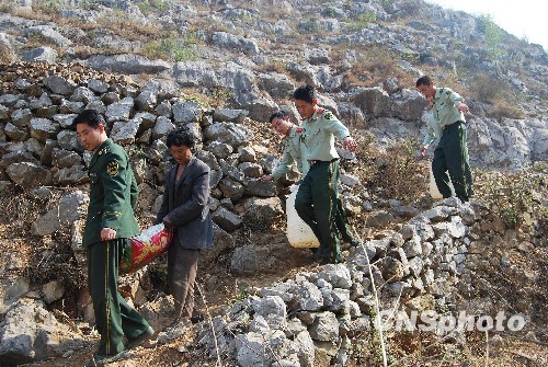 2010年3月21日,位于贵州西南部的六盘水地区出现百年一遇重旱。随着旱情加重,参与抗旱的武警交通部队官兵进村进户,通过肩挑背扛将水、米、面等救灾物资送到村民家中。中新社发 卢士勇 摄