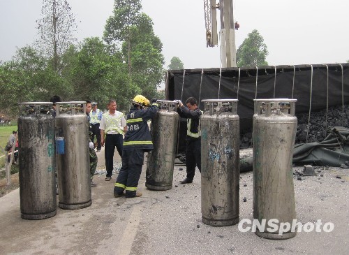 22日下午14时许,广西贵港市境内一辆运载焦炭的大货车与一辆载客24人的客车相撞,导致4人死亡,20余人受伤。图为贵港消防官兵事后在货车装载的焦炭中扒出几罐疑似氧气瓶的物体,并进行安全处置。中新社发 杨文福 摄