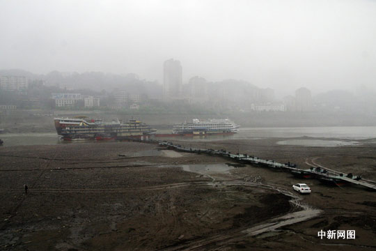 中新网重庆3月23日电 受去冬今春西南地区干旱影响,长江、嘉陵江重庆段水位持续下降。3月23日,记者在重庆市朝天门嘉陵江与长江交汇处看到,大面积河床裸露出来,部分水段已见底。据相关部门通报,截止3月22日,长江重庆段水位退落至0.31米,比去年同期低了近2米。孟幻 摄