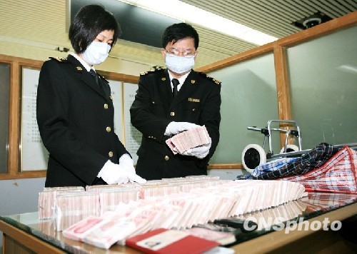 3月23日,深圳罗湖海关查获一名出境香港女子携带未向海关申报的人民币160万元,这是今年以来该关查获最大宗的旅客违规超带人民币现钞出境案。中新社发 陈文 摄