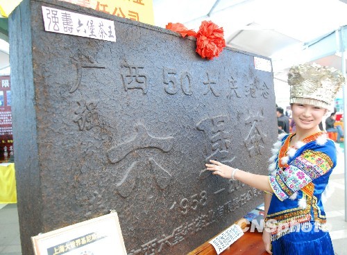 3月25日,在梧州市广西春茶节“六堡茶”展厅,一名侗族姑娘在好奇的触摸“六堡茶王”。当日,在梧州市举行的第三届广西春茶节精品“六堡茶”拍卖会上,一块长2008毫米、宽1250毫米、厚300毫米的,重1362斤的 “六堡茶王”被拍出145万元的天价。中新社发 喻湘泉 摄
