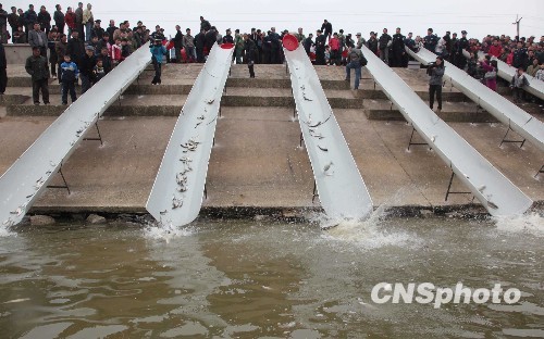 3月27日,安徽省合肥市畜牧水产局在合肥巢湖岸边的肥西县投放10万尾鱼苗进行人工增殖放流。本次放流的鱼苗有花鲢、白鲢、青鱼等多个品种,总重1万多斤,价值5万多元。活动旨在通过放流,使巢湖鱼类种质资源得到有效补充和恢复,保护其水域资源和生态环境。中新社发 张娅子 摄