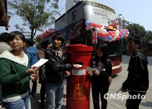 3月27日,福州市民正在英国世博大巴前参与“寄语英国馆”赢取世博门票的活动。当日,英国世博大巴开进福州,向福州市民展示上海世博会英国馆的独特魅力。中新社发 王东明 摄