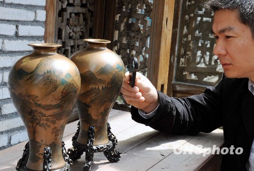 3月31日,福建一名收藏爱好者通过放大镜仔细观赏即将启运上海世博会福建馆参展的百年漆器珍品《梅瓶》。该对脱胎漆器珍品《梅瓶》瓶高约31公分、口径6.5公分,为福州脱胎漆器创始人沈绍安第五代玄孙继承人、晚清时期的漆艺大师沈正镐制作,瓶身圆润、周身描绘青绿山水、表面薄料、历经百年而不褪色。《梅瓶》于1903年被一美国商人收购珍藏,2009年福州收藏家林旭通过网上拍卖而使得该珍品回归故里。福州脱胎漆器与北京的景泰蓝、江西的景德镇瓷器并称为中国传统工艺的“三宝”,享誉海内外。中新社发 刘可耕 摄