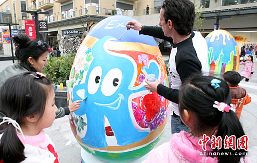4月4日,由两位中外艺术家和申城儿童共同执笔完成的“海宝”彩蛋亮相上海金桥国际广场,吸引了不少路人的目光。随着上海世博会开幕的临近,上海街头的“世博元素”日渐增多。中新社发 汤彦俊 摄