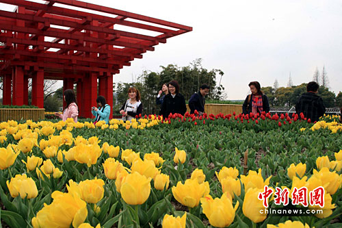 4月4日,以“世博‘卉’,汇世界花卉”为主题的2010上海花展,吸引数万上海市民踏青观赏,上海世博会中国馆为主体的花卉景点,成花展最大亮点。来自13个举办过世博会的国家和100多个上海世博会参展国的国树、国花齐聚花展。中新社发 潘索菲 摄